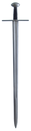 ![]() | Das einhändige Schwert ist neben dem Dolch oder Messer die wohl älteste Blankwaffe. Die Gesamtlänge bewegt sich zwischen 90 und 110 cm. Hier hat, wie der Name schon sagt, ausschließlich eine Hand auf dem Griff Platz. In der Regel führte man mit dem Einhänder einen Schild, welcher sehr unterschiedlich ausfiel - je nach Umfeld des Kampfs. Prinzipiell waren Schilde im Zweikampf eher kleiner als die Varianten in der Schlacht. Der berümte Vertreter dieser "Fechtschilde" ist der sogenannte Buckler.