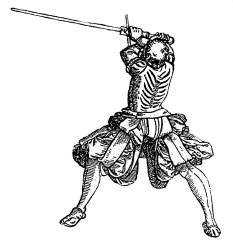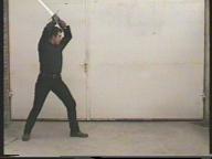 Das Schwert befindet sich über dem Kopf, die lange Schneide zeigt nach oben und ist leicht schräg.